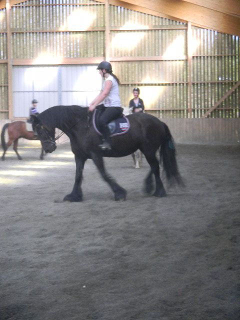 Venus était au travail avec Helo. Quelle maîtrise. Ils faisaient bonne équipe tous les 2. Elle a aussi gentiment accepté de faire la débutante pour tester ses réactions. Plutôt cool sauf lorsqu'on laisse les rênes laches. Là il part au super galop! Le cours était axé technique avec le passage du pas au galop. Vénus y arrive sans problème. Opaline était au taquet mais Kiki tenait bien sa jument en main. Tranquille le gars!!! Prêt pour la course d'endurance du lendemain. Caro sur Piper, tranquille. Du beau travail a été accompli avec la demoiselle qui était tellement peureuse il y a encore quelques semaines. Quant aux autres dont j'oublie les prénoms et le nom des chevaux (je m'en excuse), pareil, quelle maîtrise!!! Après le cours, Helo m'a proposée d'aller en carrière avec Venus pour le lâcher et voir comment il réagit en liberté. Elle l'a amadoué avec de l'herbe et cela a marché. Il la suivait puis elle lui demanda des départs au trôt ou galop et Monsieur a obéit. Elle a fait celle qui l'ignorait, qui ne voulait pas le voir, et il partait dans son coin. Après elle le faisait stopper et il obéissait. Il est vraiment bien ce cheval, tout le monde le dit. C'est super mais il faut qu'il apprenne à nous accepter nous les débutants et nous en tant que famille. On dit que le cheval choisit son cavalier. En voyant Hello avec lui, j'ai commencé à me dire qu'il était en train de la choisir. Et moi alors!!!! Je sais pertinemment qu'il faut être patient mais vivement le moment où on montera tous dessus sans surprise et avec maitrise. Je pense qu'une bonne année d'adaptation avec nous est nécessaire et j'ai réellement envie de faire le travail qu'Helo a fait devant moi. Je pense que c'est important pour nous mettre en confiance lui et nous.Et puis on va aussi progresser techniquement....