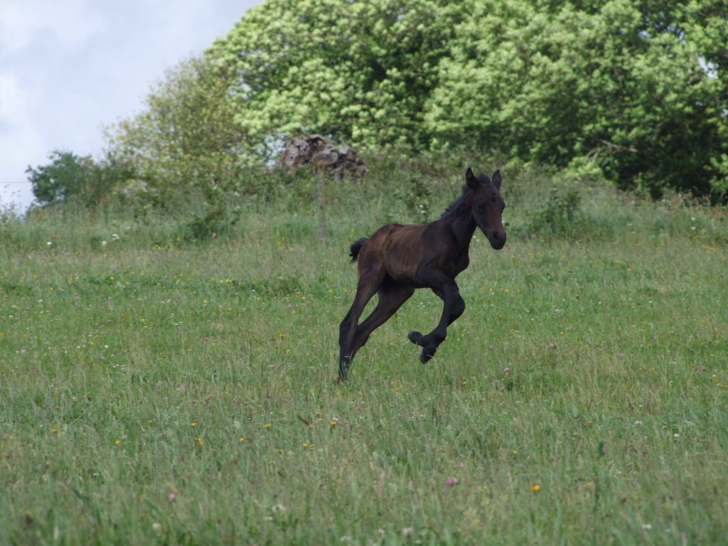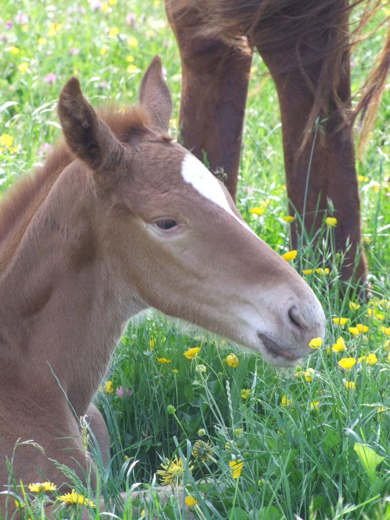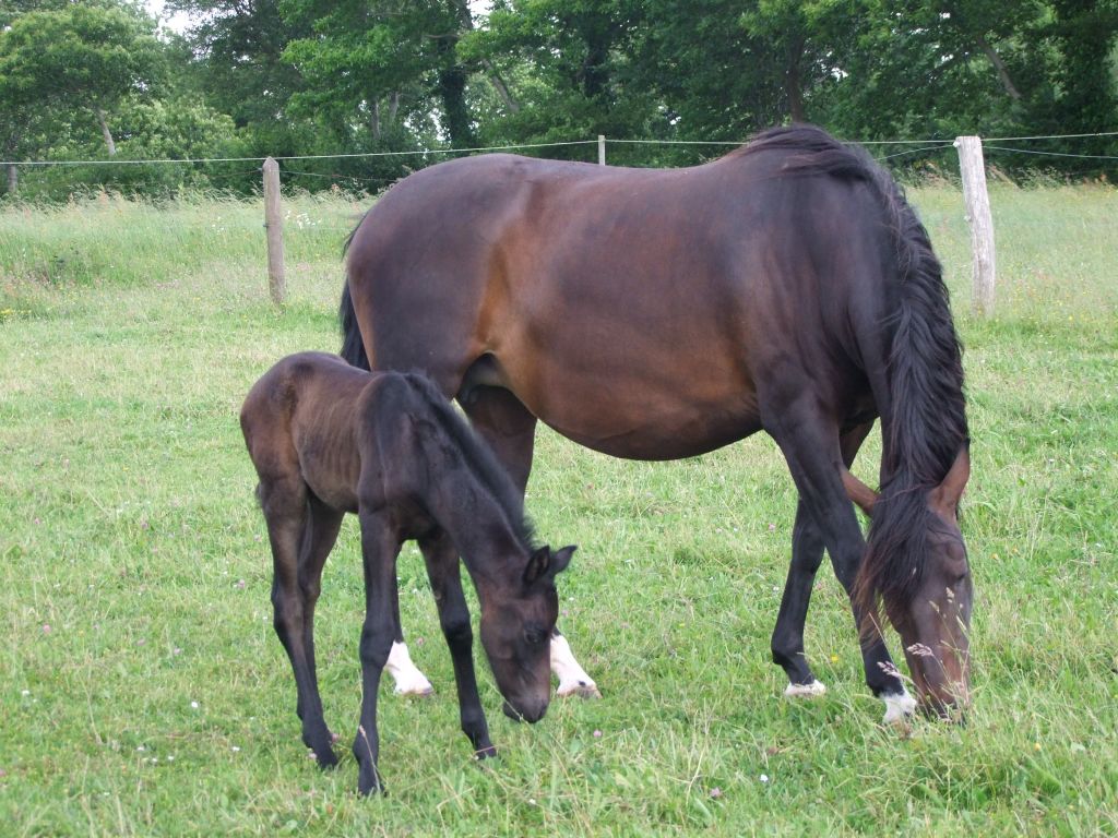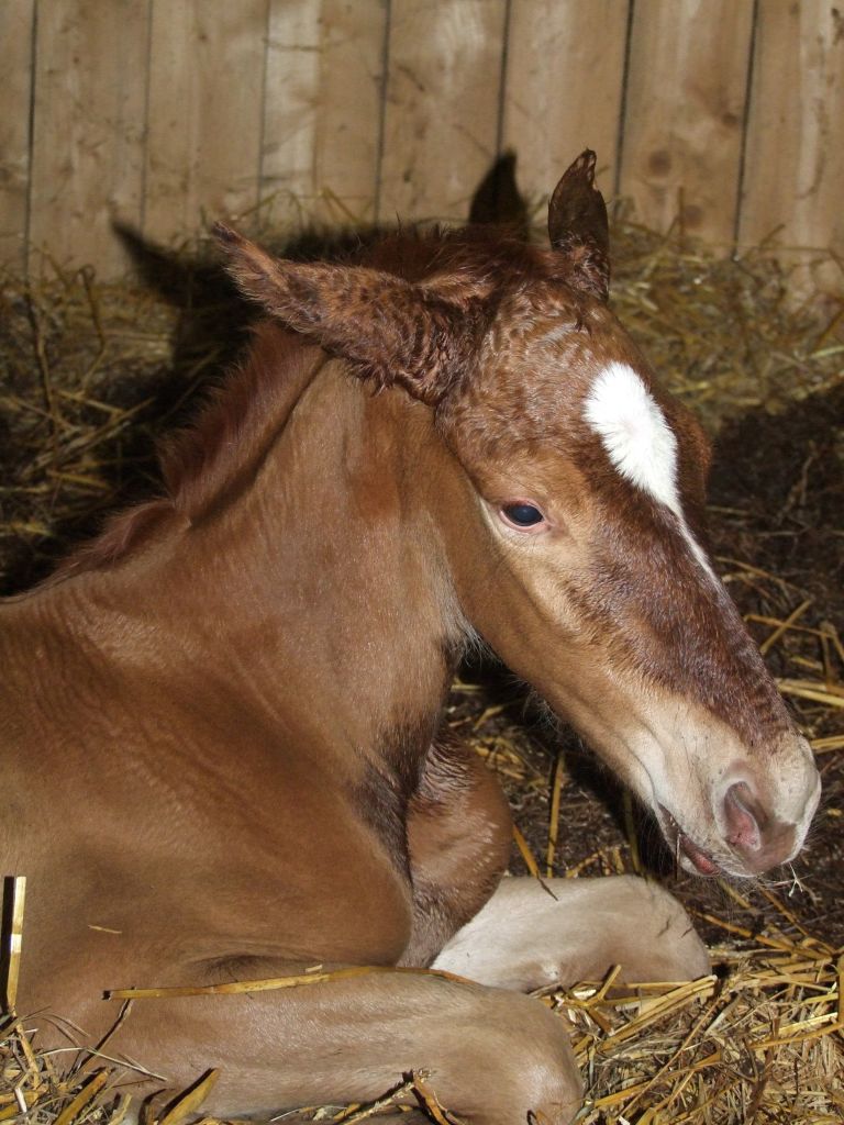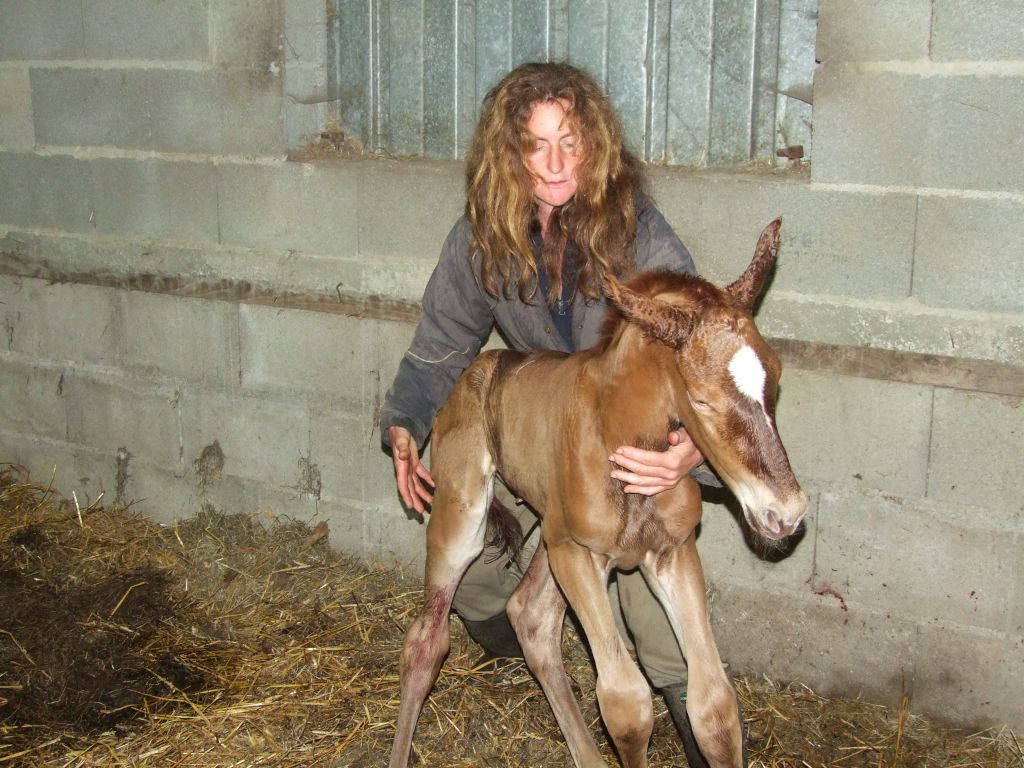Le bip fonctionna de manière identique; Olivier sauta sur la caméra, moi sur mes vêtements et là aïe, on ne voyait qu'une patte sortir. Lumière allumée, jument agacée, Lehna se leva, on pouvait voir le nez du poulain et l'unique antérieur. Instinctivement, je partis à la recherche de la deuxième et ouf elle apparut; Lenha finit son boulot, juste un petit coup de main pour tirer le petit et l'attrapper dans mes bras car Madame était toujours debout ! Un beau poulain pour l'instant bai, je rêvais d'une femelle isabelle, tant pis, ce sera pour la prochaine fois...Maman et Bébé vont bien, c'est l'essentiel !!
