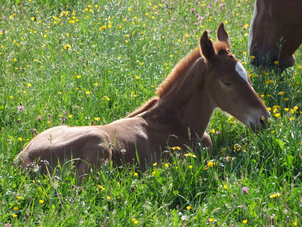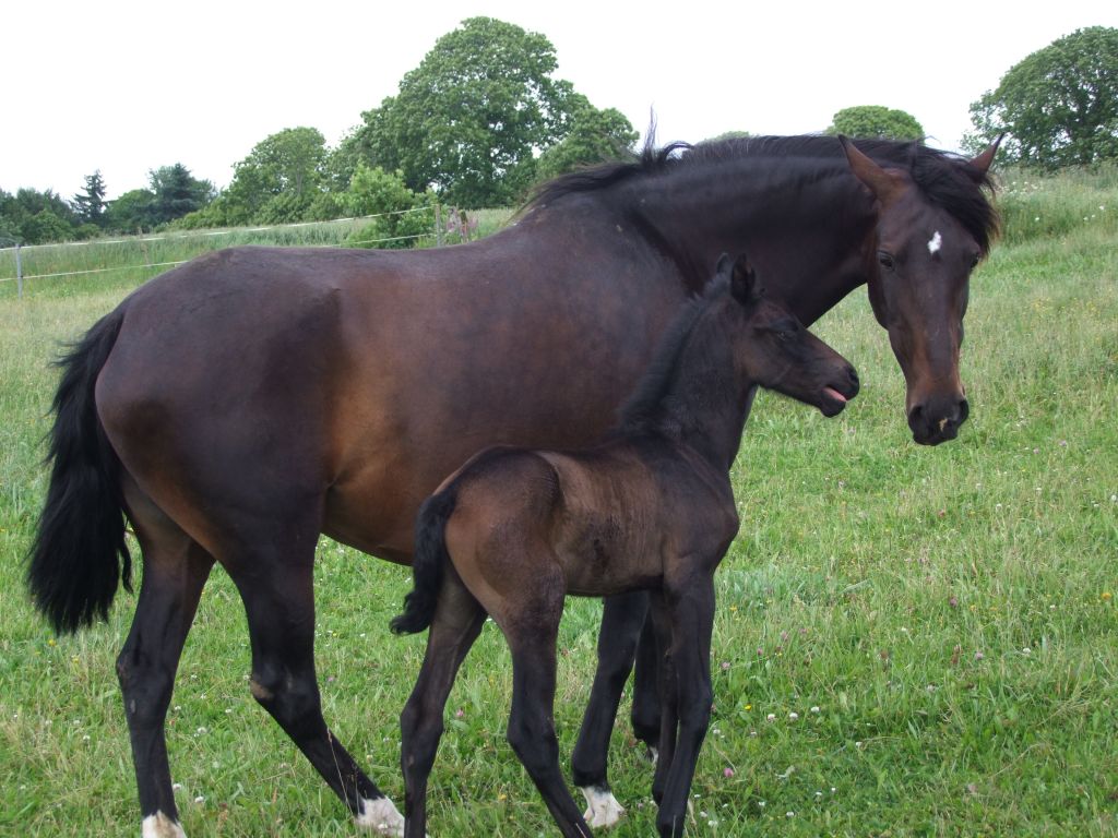 Une heure plus tard, la petite était debout. Et une heure plus tard encore, on s'acharnait sur les tétons de Lola pour faire boire Mademoiselle. Bref, un poulinage de rêve, une jument autrefois si puissante sur les barres transformée en une maman toute attentionnée et délicate. Chaque déplacement autour de sa pouliche était précieusement calculé. Beaucoup de sensibilité dans un si gros corps...