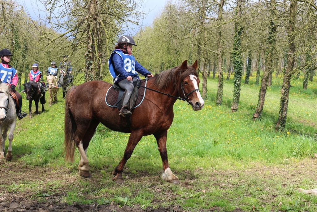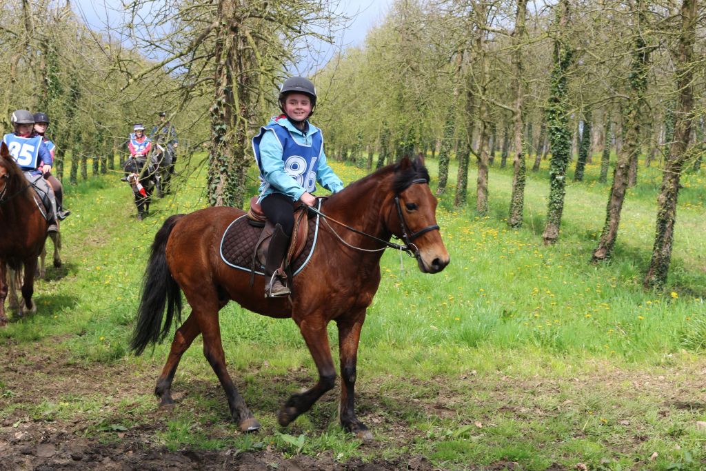 Le temps de manger, de vérifier nos 6 jeunes cavaliers, et nous voilà repartis : Mila montait Loustic, Célestin Katia, Camille Prune, Maëline Tornado, Margot Léo, et Aude Sissi et Laulau chapotait le petit groupe derrière. Un spécial bravo à tous nos jeunes cavaliers qui ont donné le maximum. Un groupe bien en ligne au moment de galoper dans les pommiers. Tellement bien en ligne que j'en ai oublié Katia qui aimait particulièrement couper en passant sous les branches laissant Célestin au sol, c'était à 1 minute de l'arrivée, grr... le temps de consoler, de remettre le cavalier en selle et de recharger les batteries, on arrivait avec le groupe. 3 minutes de retard par rapport à la vitesse max, dommage mais pas mal quand même ce qui donne les résultats suivants: