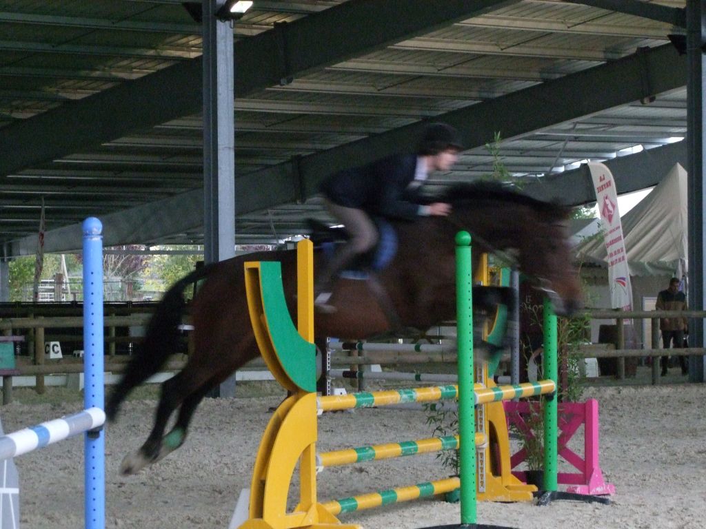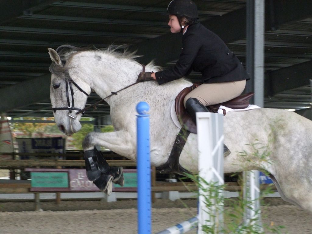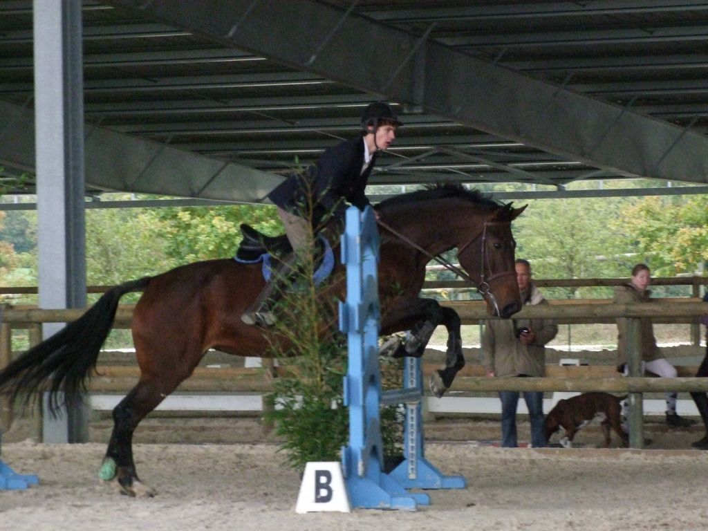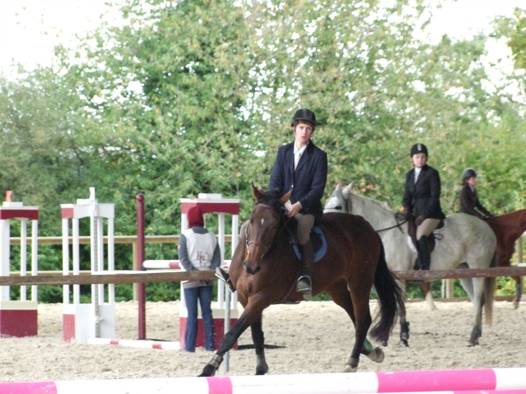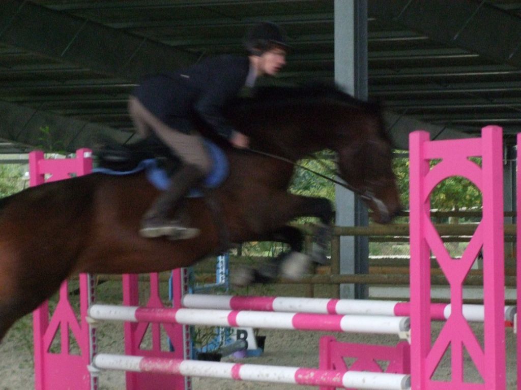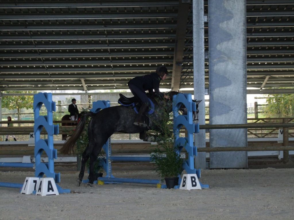 Sébastien ( notre Sébastien ) commence à détendre Termi pas franchement en confiance, tout se solde par une mise au point pour finalement se braquer définitivement. Mal parti ! bon rien de méchant, avec Termi, je m'attends à tout donc je grimpe dessus à l'improviste, j'enfile ma tenue en quatrième vitesse et me voilà sur le beau Termi et les barres. Miraculeusement, il avait oublié Sébastien, une femme sur son dos, c'est tellement mieux !!! ( lol ) une détente super et je vais sur le tour. Le 1, super, réception sur le pied droit incroyable, j'enchaîne le 2 dans le calme qui était suivi à 4 foulées d'un oxer, super je l'ai laissé choisir son allure mais après le 3, plus de direction et le voilà parti vers la détente qui était juste à côté, Monsieur fonce dans la séparation qui heureusement tombe et je me retrouve parmi les chevaux de la détente, gros lol, je remonte dessus et je repars sur mon tour, après le 3, c'était une transition au trot en un point précis suivi d'un slalom puis d'un oxer ( petite dérobade de ma faute manque de jambes ), on refait, ensuite une volte au galop avec une transition au trot puis un saut de biais avec des passages obligés, tout va bien, étonnant, le 7 était un saut de puce à faire au trot ( heureusement, on avait rabaché en cours ), le 8 un oxer, il décide en galopant devant, très bien et du coup je termine le 9 et le 10 au galop sans hésitation sauf que je n'ai pas dû respecter le contrat de 4 foulées, mais tant pis, la confiance était là et l'envie d'aller de l'autre côté.