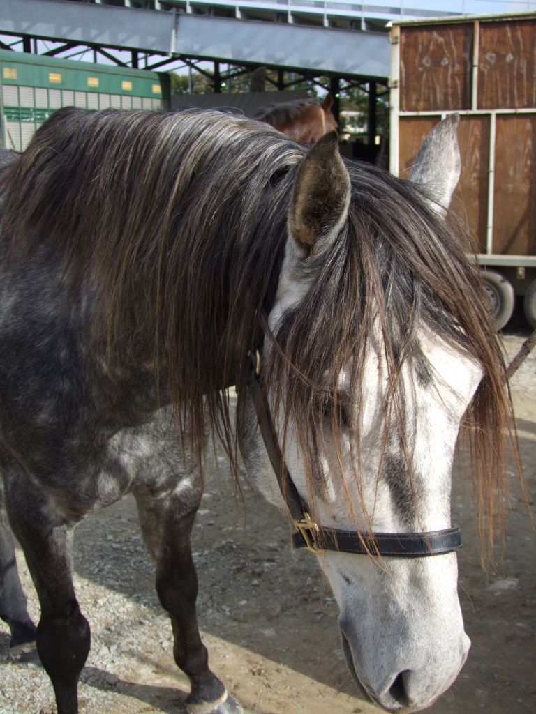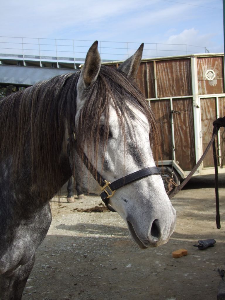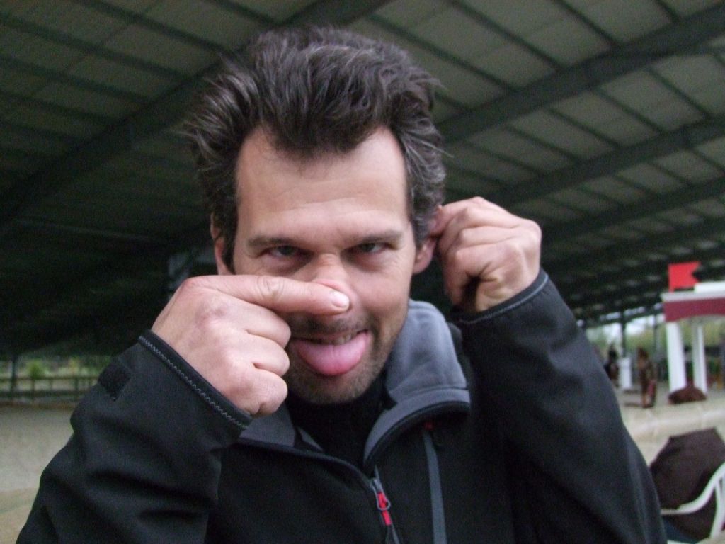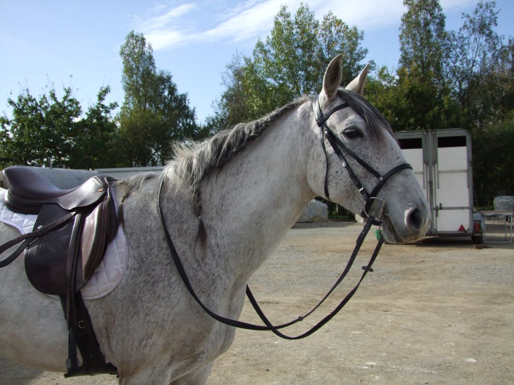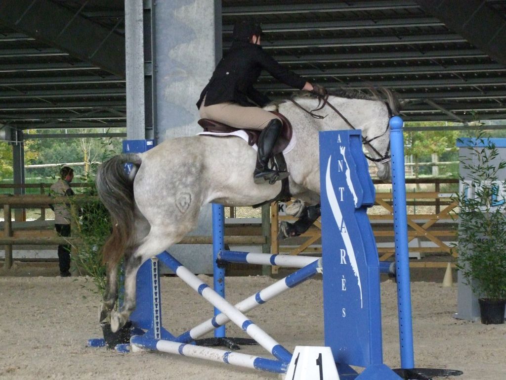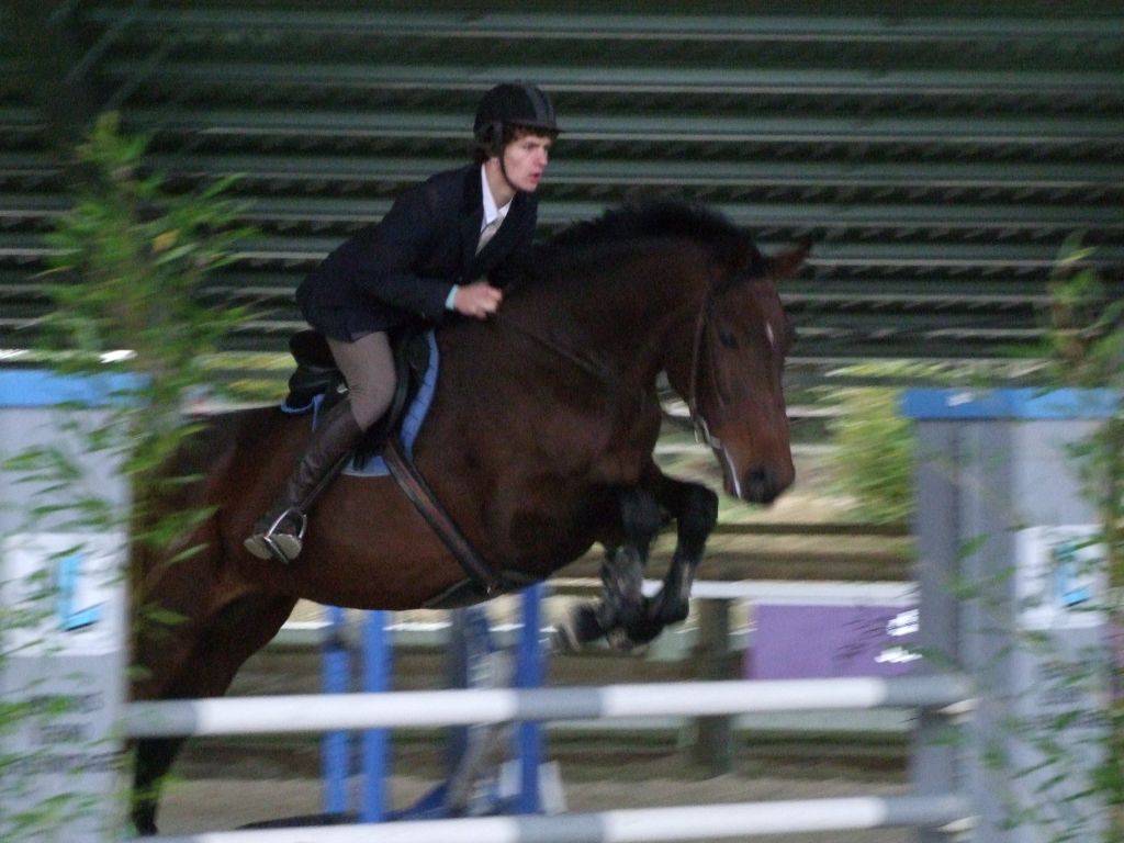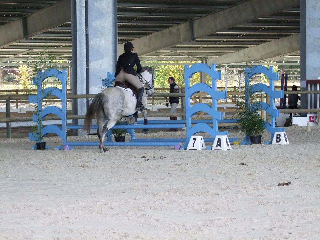 Sébastien ( notre Sébastien ) commence à détendre Termi pas franchement en confiance, tout se solde par une mise au point pour finalement se braquer définitivement. Mal parti ! bon rien de méchant, avec Termi, je m'attends à tout donc je grimpe dessus à l'improviste, j'enfile ma tenue en quatrième vitesse et me voilà sur le beau Termi et les barres. Miraculeusement, il avait oublié Sébastien, une femme sur son dos, c'est tellement mieux !!! ( lol ) une détente super et je vais sur le tour. Le 1, super, réception sur le pied droit incroyable, j'enchaîne le 2 dans le calme qui était suivi à 4 foulées d'un oxer, super je l'ai laissé choisir son allure mais après le 3, plus de direction et le voilà parti vers la détente qui était juste à côté, Monsieur fonce dans la séparation qui heureusement tombe et je me retrouve parmi les chevaux de la détente, gros lol, je remonte dessus et je repars sur mon tour, après le 3, c'était une transition au trot en un point précis suivi d'un slalom puis d'un oxer ( petite dérobade de ma faute manque de jambes ), on refait, ensuite une volte au galop avec une transition au trot puis un saut de biais avec des passages obligés, tout va bien, étonnant, le 7 était un saut de puce à faire au trot ( heureusement, on avait rabaché en cours ), le 8 un oxer, il décide en galopant devant, très bien et du coup je termine le 9 et le 10 au galop sans hésitation sauf que je n'ai pas dû respecter le contrat de 4 foulées, mais tant pis, la confiance était là et l'envie d'aller de l'autre côté.