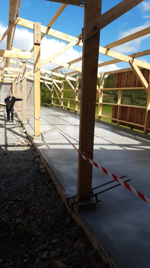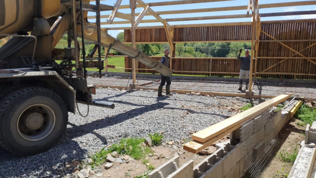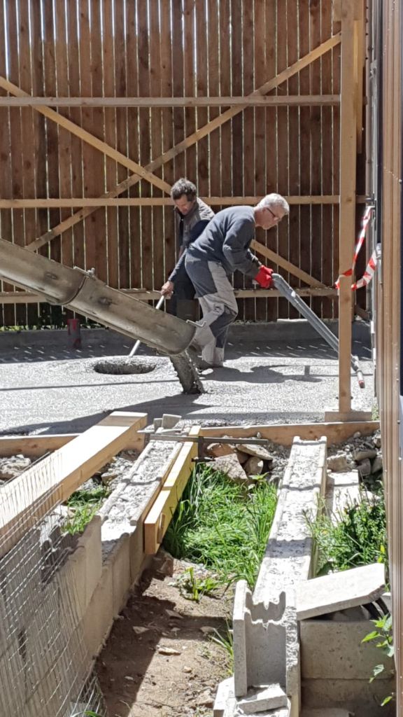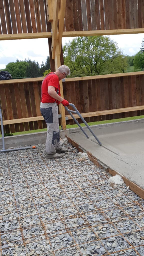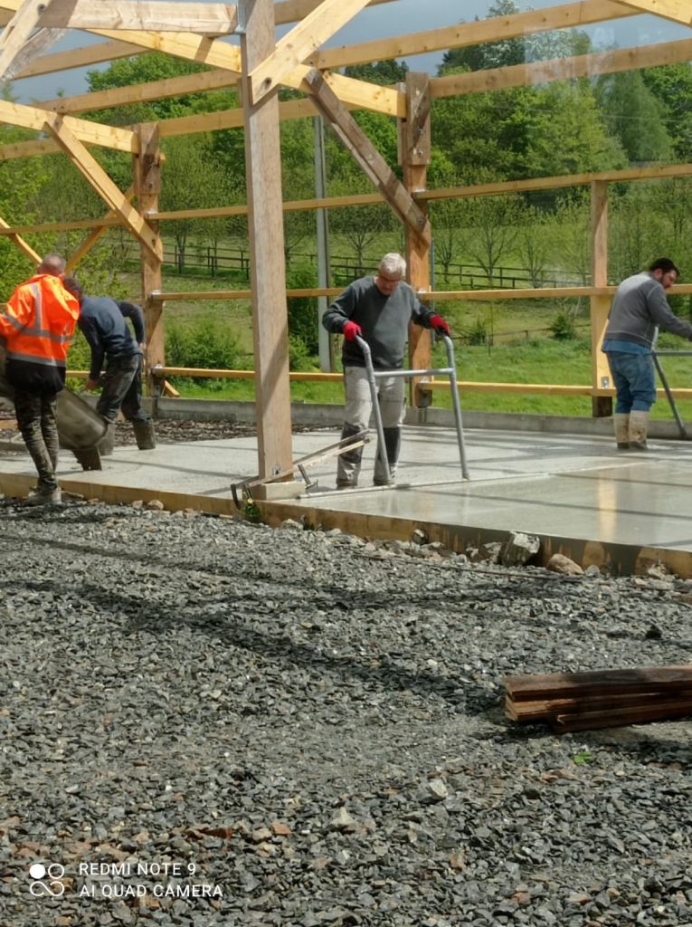 Toujours est il que la 1ère toupie est arrivée pile à l'heure ... On a pu donc commencer le coulage de la dalle du préau sous le soleil, prédiction honorée par le ciel ! Nos reporters, Gaelle et Floriane ont immortalisé cette tâche acharnée... Et encore, j'avais bien prévenu Christian que le S7 était un peu liquide ! Craignant de retrouver le précieux contenu dans le Beuvron, j'ai préférré me rabattre sur du S5... Sage décision ! N'est ce pas Maître ?!